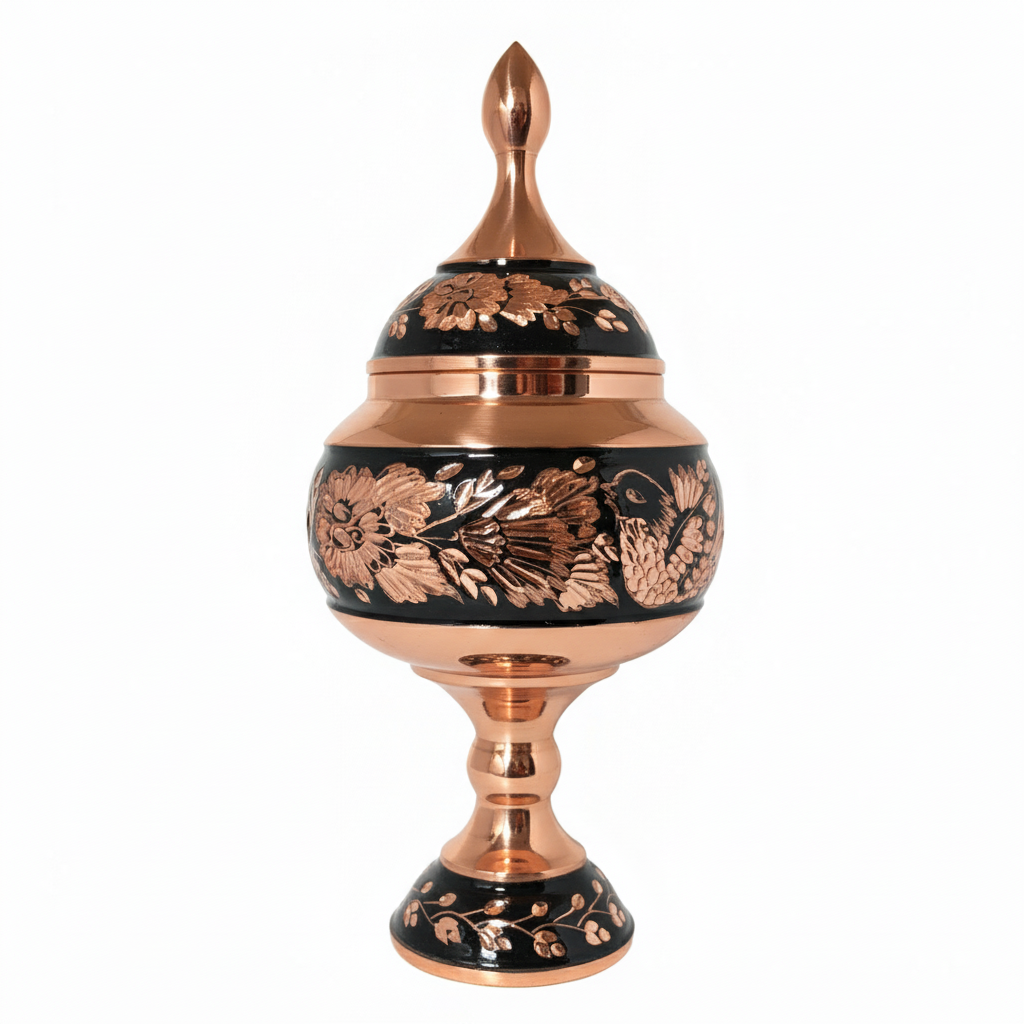 این شکلاتخوری مسی «الماستراش» نتیجه مهارت نسلهای پیاپی فلزکاران اصفهان است؛ ظرفی که از نخستین ضربههای چکش تا آخرین پیدایشِ درخشندگی سطح، بر پایۀ ذوق، تجربه و سنت هنری شکل گرفته است. ارتفاع آن اندکی بیش از بیست سانتیمتر است و دهانه، شکم و پایه هرکدام در بازهای نزدیک به اندازههای اعلامشده ساخته شدهاند، اما نه با تکیه بر قالبهای سخت و ثابت؛ بلکه با انتخابهای میلیمتری آگاهانه که تنها یک هنرمند باتجربه میتواند انجام دهد. این تفاوتهای کوچک در حد چند میلیمتر—چه در دهانهای که بهجای هفت سانتیمتر اندکی باریکتر انتخاب شده، چه در ارتفاعی که دقیقاً روی 20٫5 ایستاده—همان نکاتی هستند که فرم را خوشتناسب، چشمنواز و هماهنگ کردهاند. نام «الماستراش» از تکنیک ظریفی میآید که در آن استادکار با قلمفلزی، چکش سبک، سوهان و ابزارهای برش دستی، تراشهایی ریز و دقیق بر سطح مس ایجاد میکند؛ تراشهایی که مانند لبههای یک سنگِ تراشخورده، نور را در زوایای گوناگون میشکنند و سطح ظرف را به درخشش زنده و پویا درمیآورند. این تکنیک در صنایعدستی اصفهان جایگاهی ویژه دارد و ارزش هنری ظرف را بهمراتب فراتر از یک اثر تزئینی ساده میبرد. نقوش کار شده روی بدنه، از خانواده نقشمایههای گلوبوتهای ایرانی هستند؛ نقشهایی که ریشه در هنرهای دوره صفوی و قاجار دارند و همواره نماد رشد، زندگی و زیبایی بودهاند. ترکیب این نقوش با تراشهای الماسی باعث شده سطح ظرف هم عمق بصری داشته باشد و هم بافتی که با نور و زاویۀ دید تغییر میکند. فرآیند ساخت این شکلاتخوری بهطور کامل دستی است: – ابتدا ورق مس با چکشکاری روی چرخ سنتی فرم میگیرد، – سپس با سوهان و سنگساب صیقل میشود، – بعد نقوش با قلمزن و چکش حک میگردد، – و در پایان لایۀ محافظ پلیاستر یا نانو روی آن اعمال میشود تا رنگ مس ثابت بماند، جلای آن حفظ شود و در برابر رطوبت و کدرشدن مقاوم گردد. این ظرف با وزن 270 گرم، به گونهای ساخته شده که هم سبک و خوشدست باشد و هم ثبات کافی روی پایه داشته باشد. پوشش ضدآب و ضمانت دهساله کیفیت، دوام و ماندگاری درخشندگی آن را تضمین میکند. این شکلاتخوری تنها یک ظرف نیست؛ قطعهای از هنر و فرهنگ ایرانی است. هر میلیمتر آن نتیجه یک تصمیم هنری است، هر نقش بخشی از میراث بصری اصفهان، و هر تراش نشانۀ دستان هنرمندی که زیبایی را با دقت، حوصله و احترام به سنت آفریده است. خرید این اثر یعنی انتخاب اصالت، زیبایی و هنر زندهای که سالها در کنار شما خواهد ماند.