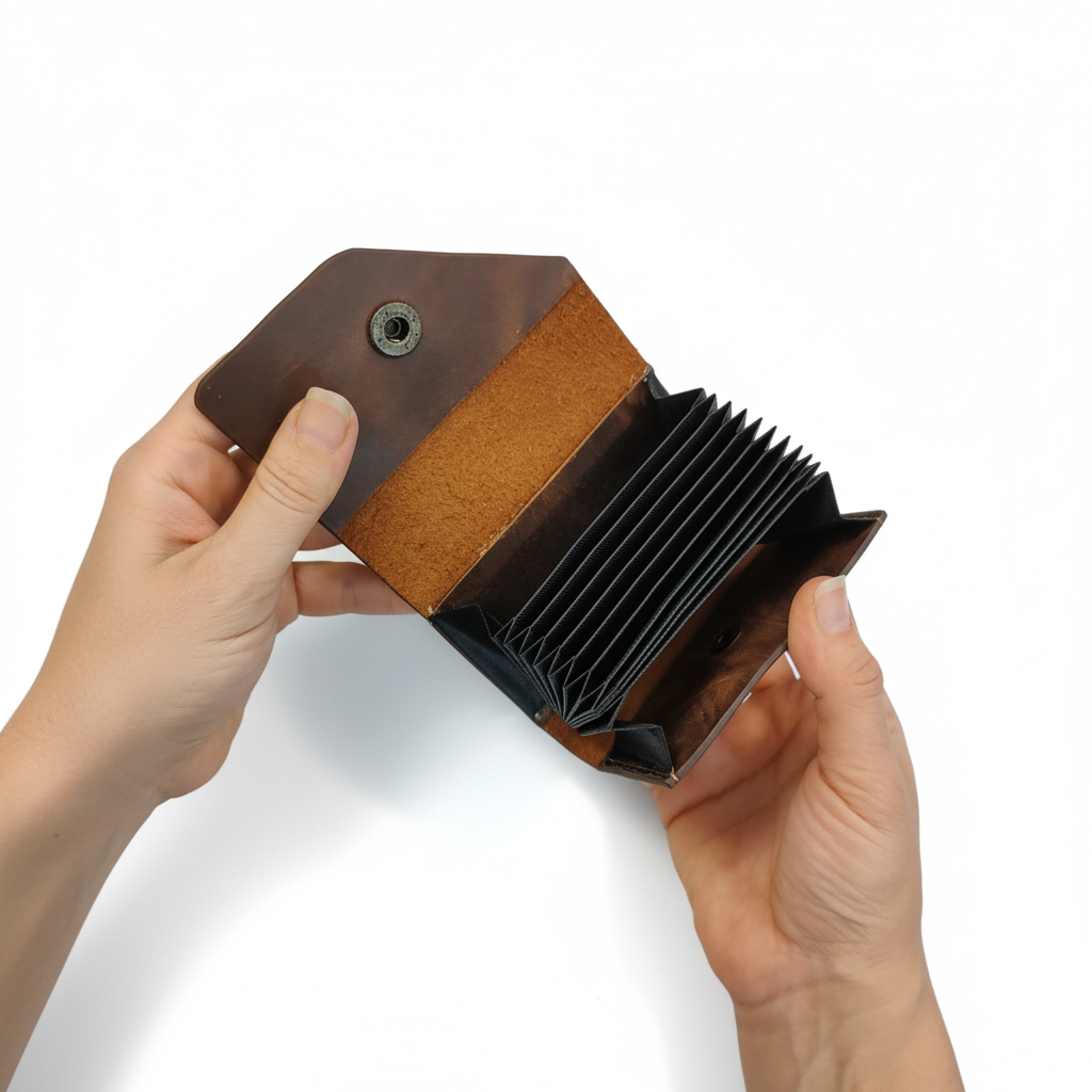 - **جاکارتی آکاردئونی چرم طبیعی**: ابعاد ۱۰.۵ × ۸ × ۲ سانتیمتر (در حالت بسته)